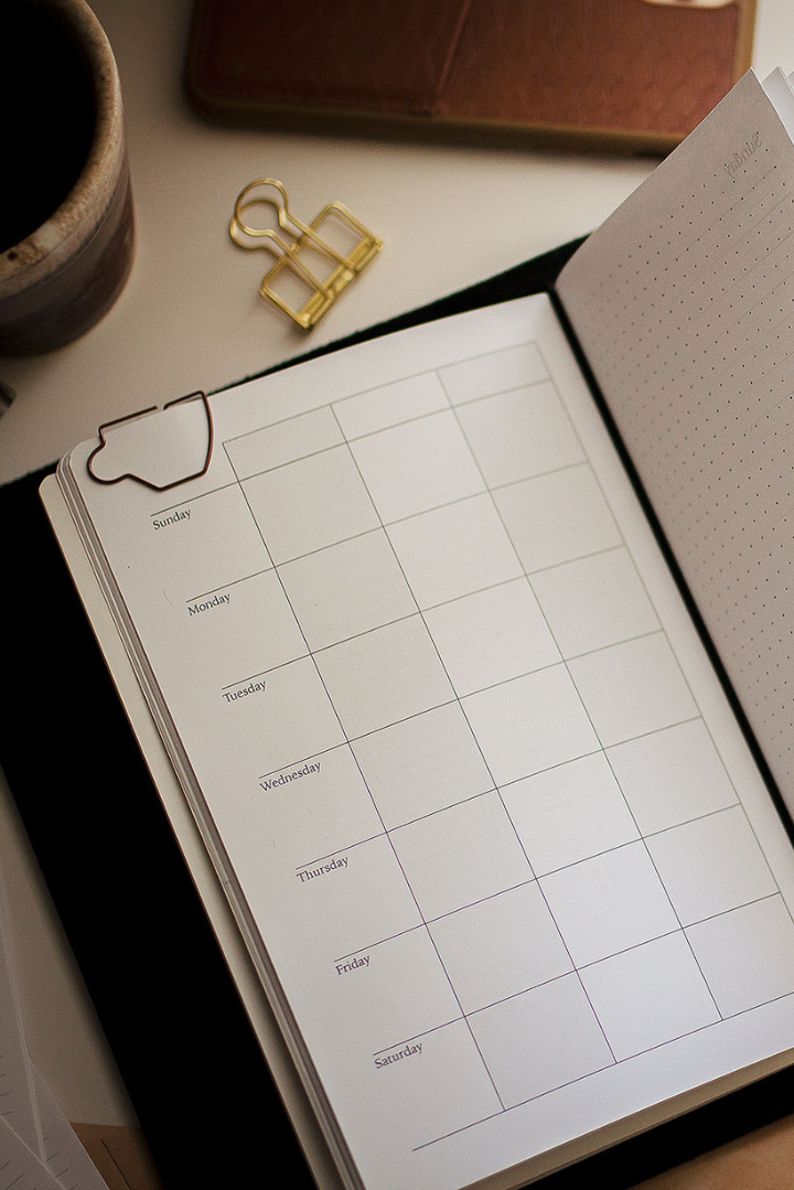 The Minimalist Sleeve features four interior elastics, allowing you to carry your Annual and Classic booklets together—with room to spare. (The binder clip included in our Accessory add-on pack is perfect for connecting this month's calendar in the Annual to this week's spread in the Classic.) Use the extra elastics for a journal, sketchbook, or even a favorite novel. Customize your setup to reflect your unique rhythm and keep everything you need close at hand.