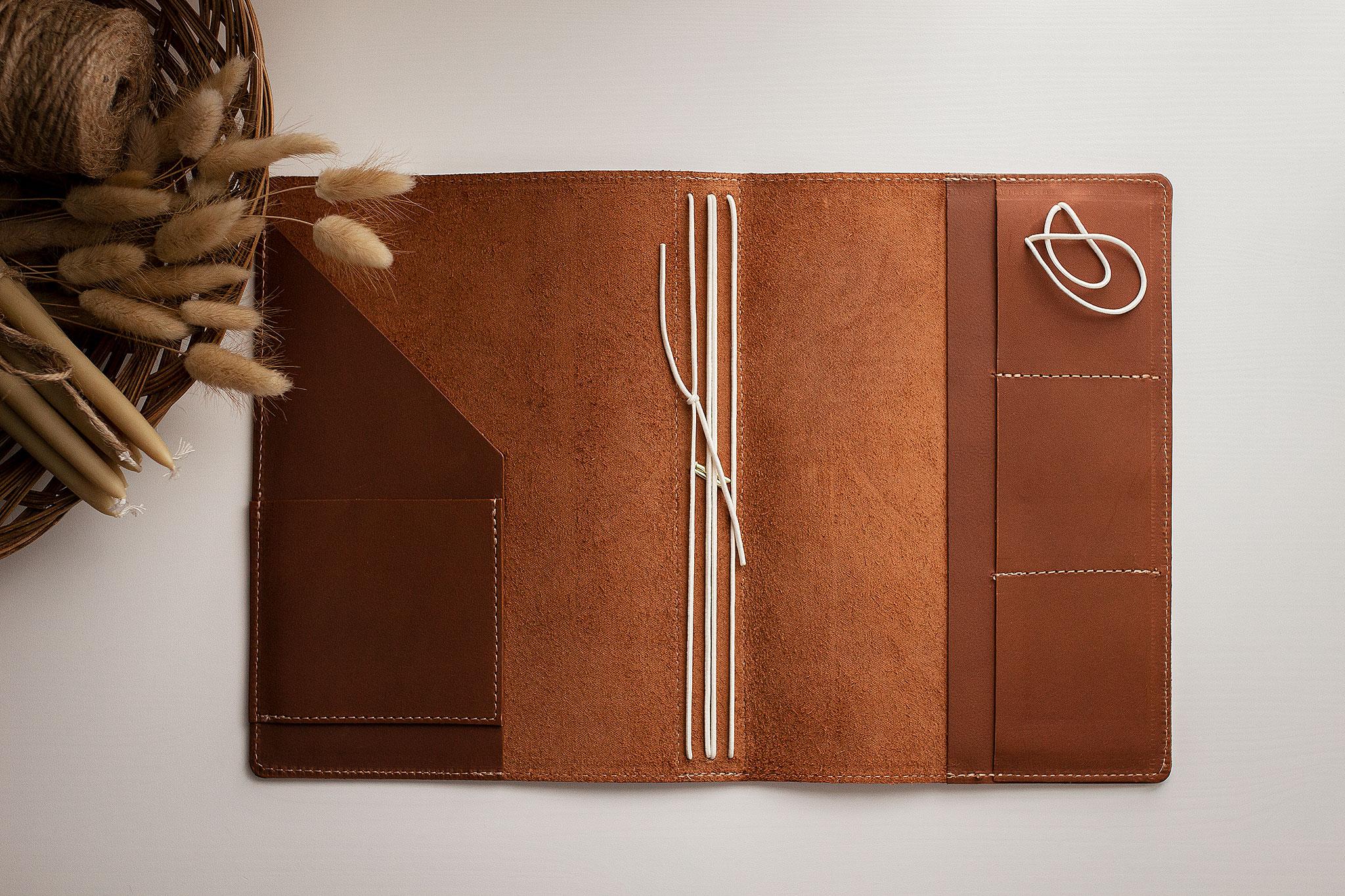 Traveler's journal style. Genuine leather with a delicious scent and buttery smooth texture. No internal pen loops or pockets. 4 elastic spine bands for booklets (perfect for our half-letter booklets; also fits a5). Closure elastic with leather pen holder tab. Rounded corners. Gorgeous stamp embossing (note whether your choice has gold foil or not). 9.5" x 14.5" when open flat.