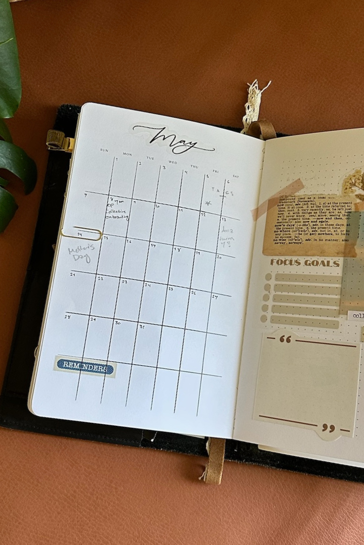 The Heirloom Cover features four interior elastics, allowing you to carry your Annual and Classic booklets together—with room to spare. (The binder clip included in our Accessory add-on pack is perfect for connecting this month's calendar in the Annual to this week's spread in the Classic.) Use the extra elastics for a journal, sketchbook, or even a favorite novel. Customize your setup to reflect your unique rhythm and keep everything you need close at hand.